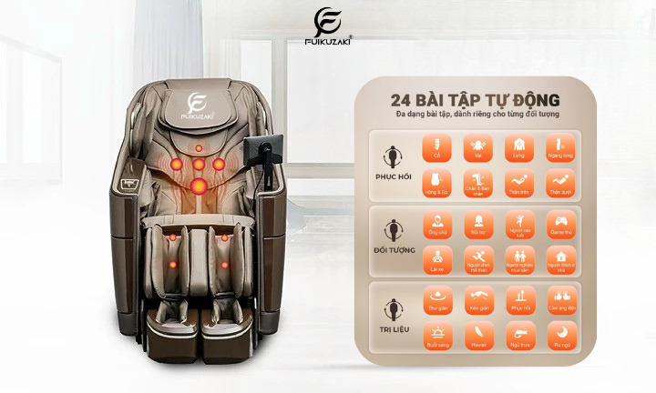 Fuikuzaki FK-68 tích hợp tới 24 chương trình massage tự động, được lập trình thông minh, từ xoa bóp thư giãn, bấm huyệt chuyên sâu, kéo giãn toàn thân cho tới các bài tập đặc thù: giảm đau lưng, thư giãn vai gáy, phục hồi sau tập luyện.