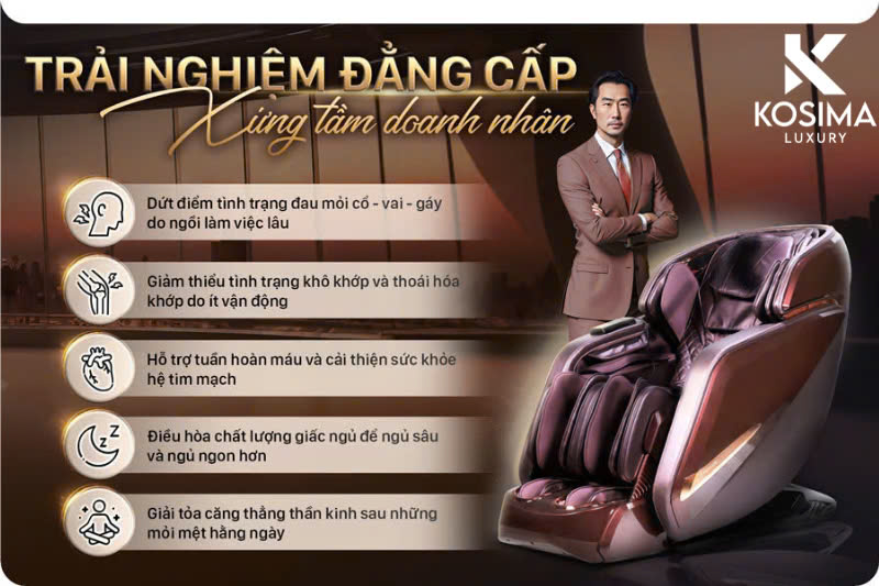Đối với những người làm kinh doanh, thường xuyên ở trong tình trạng căng thẳng do khối lượng công việc cũng như áp lực lớn, thì việc sở hữu một thiết bị chăm sóc sức khỏe toàn diện tại nhà là điều vô cùng cần thiết. Theo đó, ghế massage Kosima CZ 124 chính là một lựa chọn hoàn hảo, được thiết kế với những tính năng độc quyền, giúp bạn thư giãn trọn vẹn cả thể chất lẫn tinh thần sau ngày làm việc bận rộn.