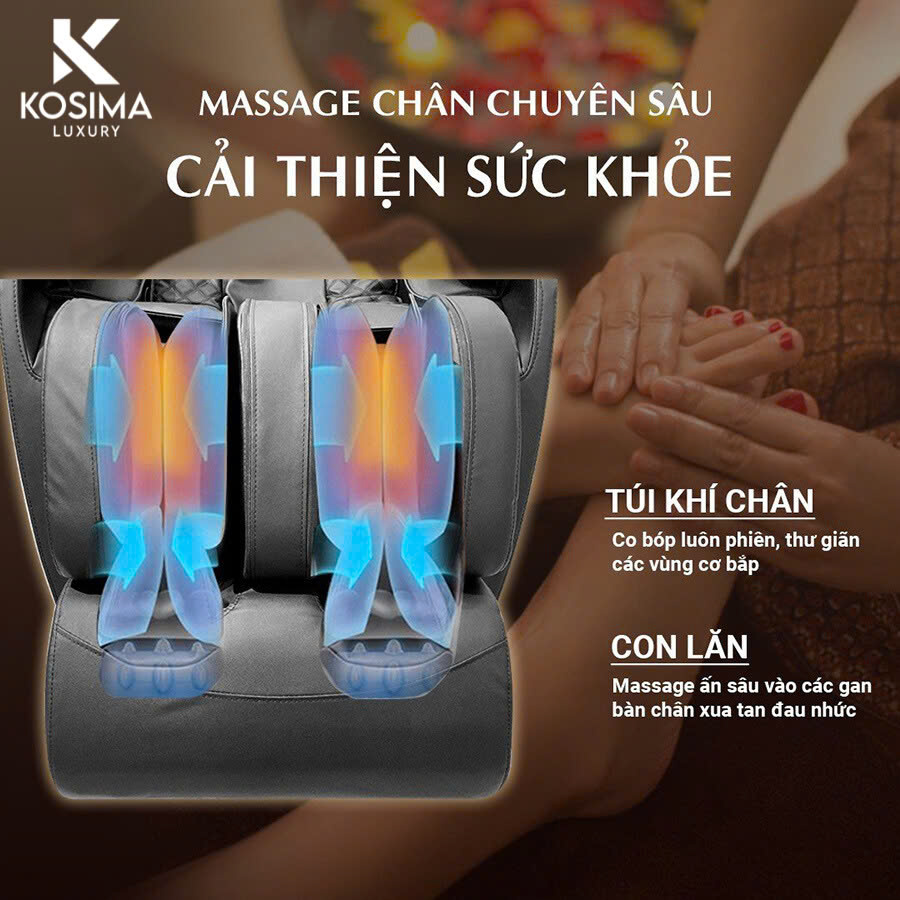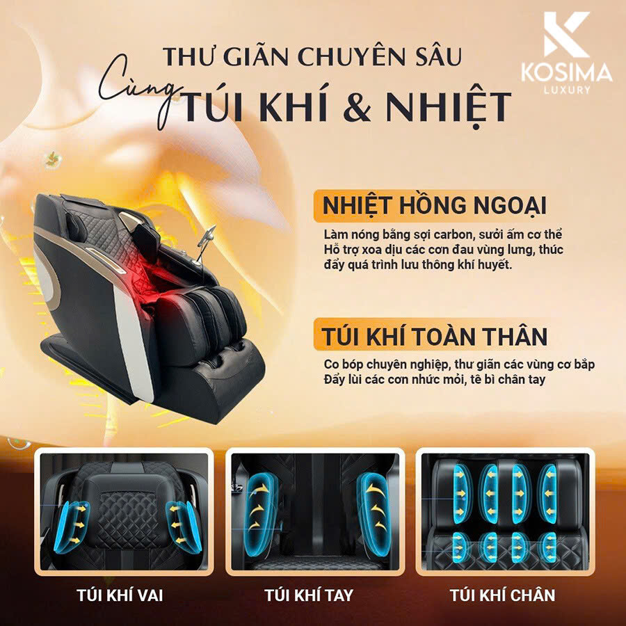Kosima JP 6666 trang bị túi khí từ đầu đến chân, giúp ôm trọn toàn bộ cơ thể. Giúp giảm căng thẳng, làm dịu các điểm áp lực, và mang đến cho bạn cảm giác thoải mái, thư giãn đáng kinh ngạc sau mỗi lần sử dụng.